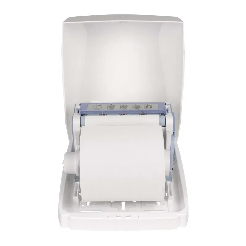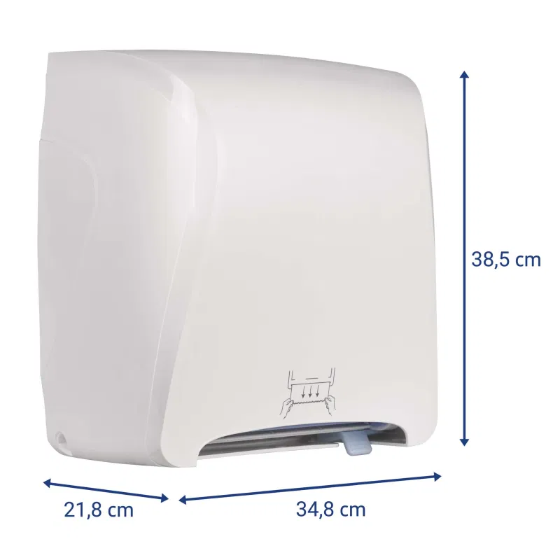 Manufactured from high-quality, shatterproof ABS plastic, the dispenser is designed for long-term durability. The lockable housing protects against unauthorized access, making it ideal for hygiene-relevant areas such as offices, craftsmanship, industry, and hospitality. The push-lever paper feed ensures smooth, reliable dispensing.